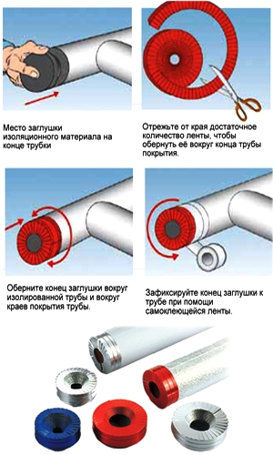 | Торцевые заглушки | Специальные заглушки для закрытия торцов изолированных трубопроводов. Для удобства идентификации труб в системе заглушки производятся следующих видов: серебряные, серые, красные, синие.